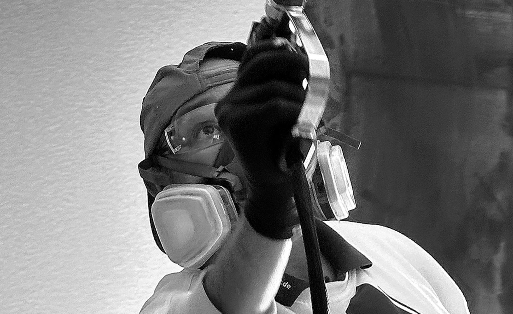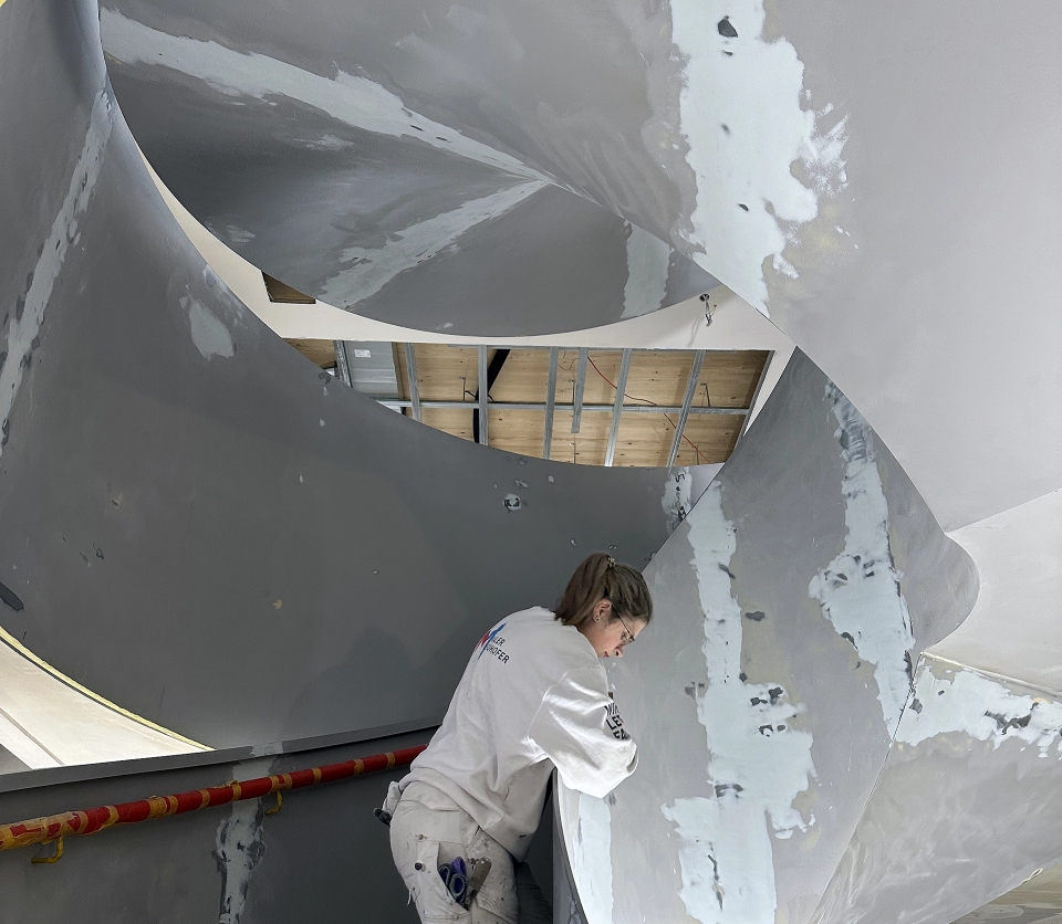 Während der gesamten Arbeiten war äußerste Vorsicht geboten. Schon kleinste Mengen Feuchtigkeit – durch Schweiß, Atem oder Staub – hätten das Ergebnis langfristig beeinträchtigen können. Deshalb wurde die Treppe über beide Stockwerke hinweg vollständig eingehaust.