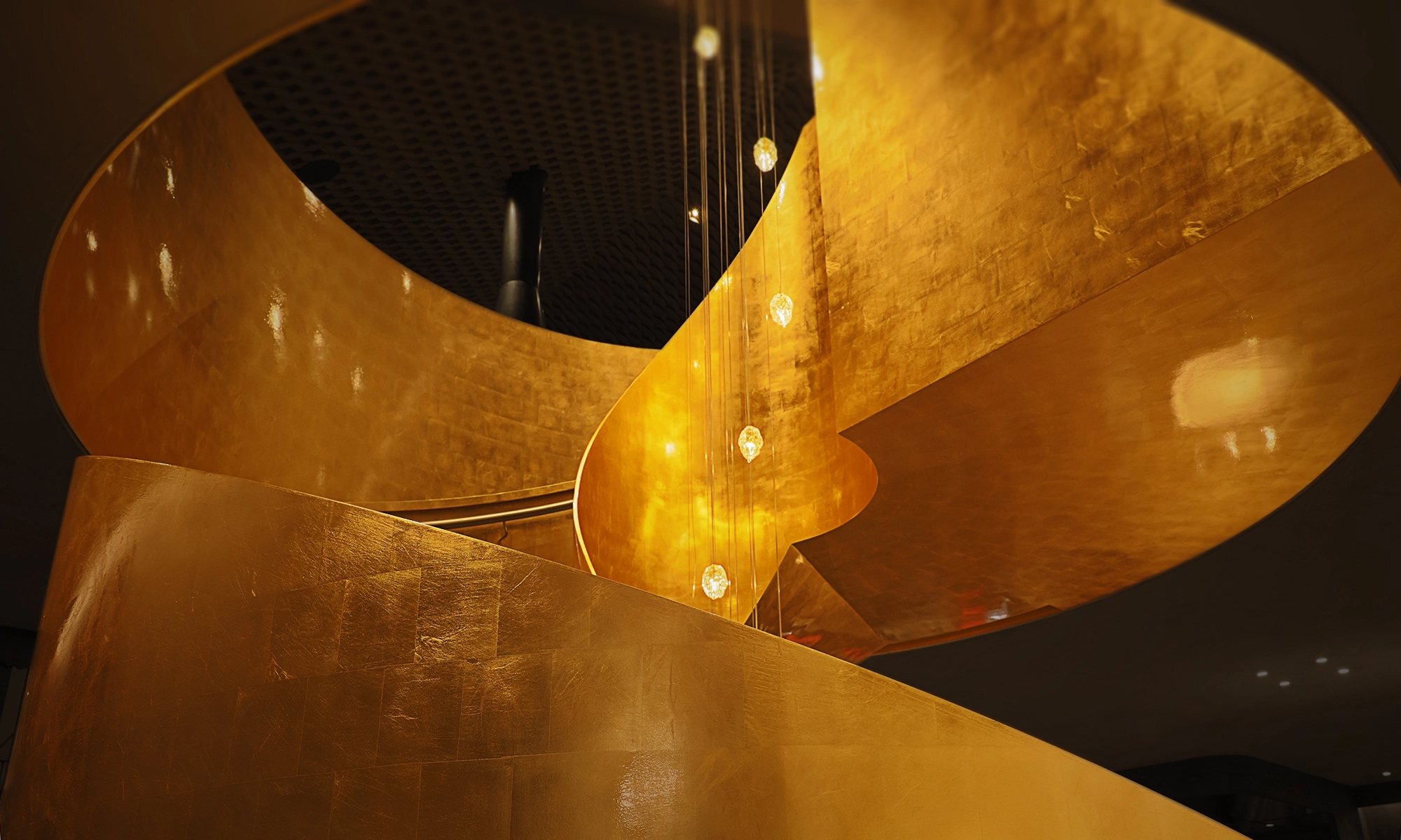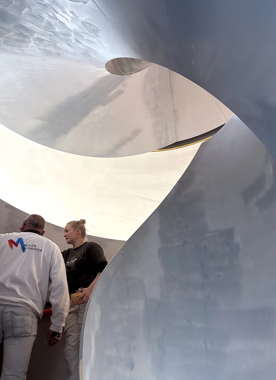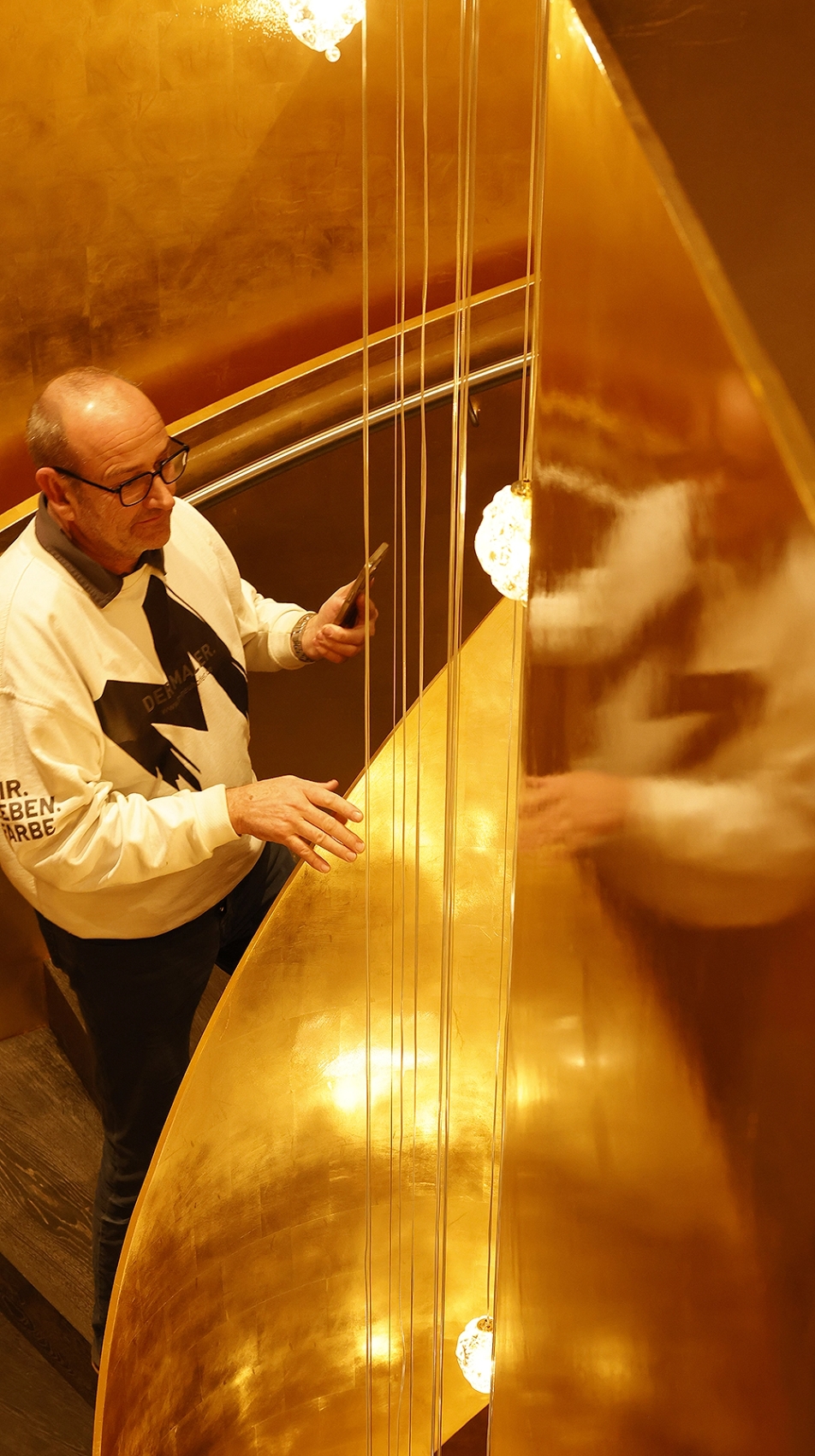 Für den Juwelier Hollfelder in Oberstaufen wurde eine frei stehende Stahlwendeltreppe vollständig vergoldet. Über zwei Stockwerke hinweg entstand ein Projekt, das nicht nur handwerklich, sondern auch organisatorisch höchste Anforderungen stellt. Planung, Koordination und Abläufe mussten exakt aufeinander abgestimmt sein – denn jeder Schritt baut auf dem vorherigen auf.